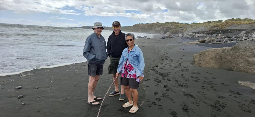 Having been sitting in the vehicles all day so far, some exercise was required. We walked across a bridge, along a river to the beach. The blackest sand I think I have ever seen. It is iron sand and is used in the production of corrugated iron. As the tide seemed to be coming in we returned to the camp and did our own catering. As we have a garden full of vegetables at the moment, I had bought tomatoes and cucumbers with us, so made us a Greek salad, followed by plum tart. Plums also from our garden.