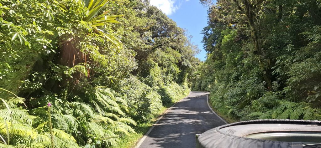 Once entering the park and leaving farmed land, the road narrowed with spectacular vegetation. Ferns of every description, trees decked with lichens and a myriad of climbing and parasitic plants. The road seemed very quiet, but when we reached the car park it was packed.