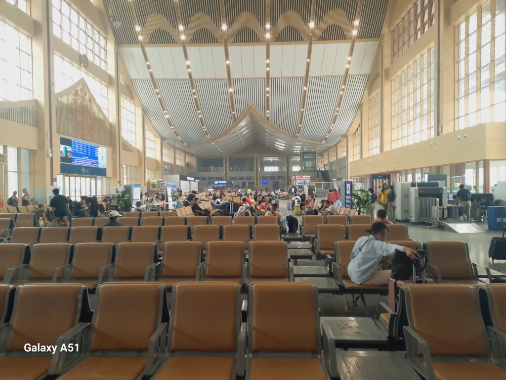 A 20min ride in the back of a small truck from the hotel to the Chinese built railway station to catch a Bullet train to Vang Vieng. The station building is enormous, the security, like any international airport! Our guide, Beam, was so concerned about us having small scissors or tweezers taken from us as potential lethal weapons, suggested we mail said items to our destination, the day before. Ultimately a wasted exercise, to my mind.