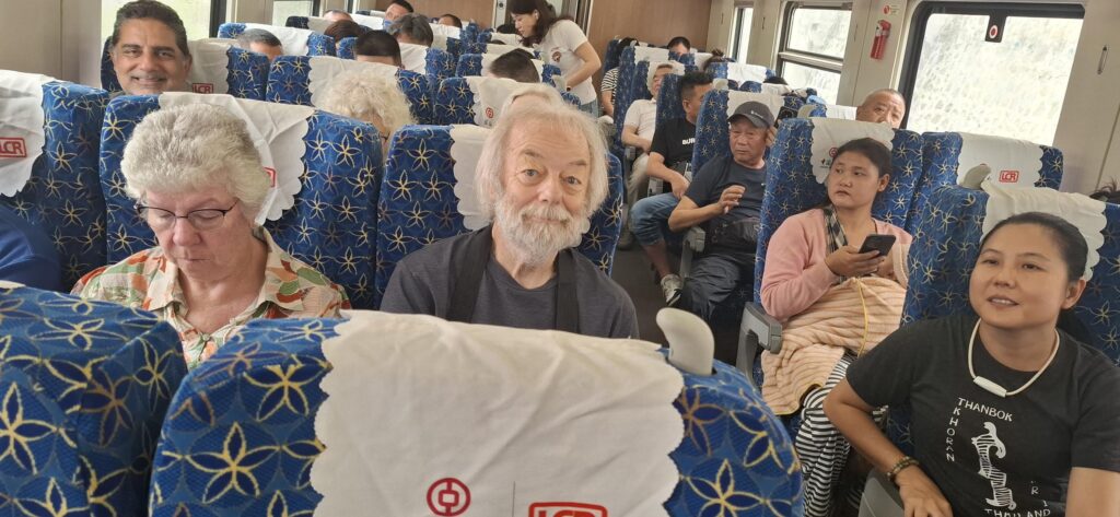 The train, like the station and railways system, Chinese built and run. After exiting the final security check, I looked out towards the enormously long train to not see a single familiar face or figure. A minor panic as I had not seen which carriage the group had alighted on…relieved when Beam our guide, waved ahead of me. So much for your mate having your interests at heart..:) She got the “tea pot” on reuniting! I had a similar experience many years ago, in Moscow, leaving the bus to take photos, looked back to see 30 busses all the same type and colour..:)